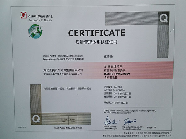 湖北正奧公司TS16949體系認(rèn)證證書(shū)201608