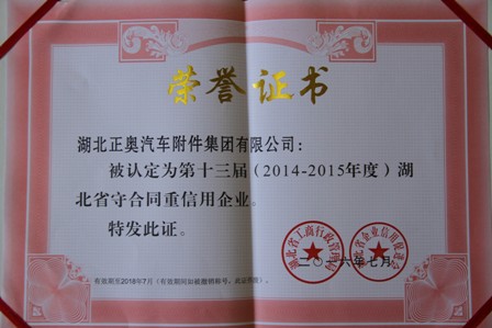 湖北正奧汽車附件集團(tuán)有限公司榮獲2014--2015年度省級(jí) “守合同重信用企業(yè)”榮譽(yù)稱號(hào),此次評(píng)選省級(jí)“守合同重信用企業(yè)”是由湖北省工商行政管理局和湖北省行業(yè)信用促進(jìn)會(huì)聯(lián)合評(píng)選并授予,此次獲獎(jiǎng)也是我公司連續(xù)多年獲得“守合同重信用企業(yè)”稱號(hào)。